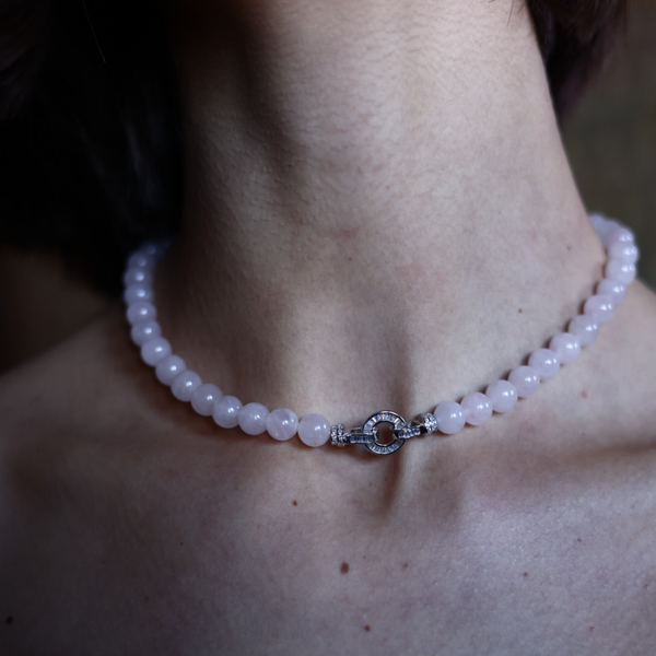 Un diseño femenino y atemporal, elaborado con piedras naturales de cuarzo rosa, apreciadas por sus suaves tonos rosados y su luminosidad natural. El cierre de plata con cristales aporta un sutil toque de brillo, elevando el diseño y convirtiéndose en un detalle elegante que equilibra dulzura y sofisticación.