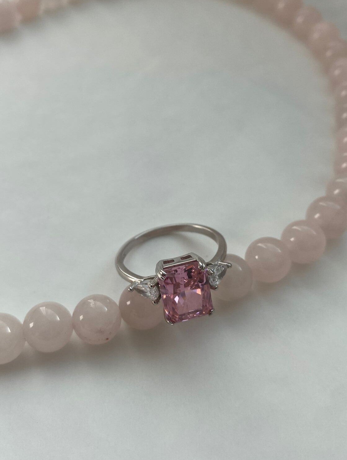 La delicadeza del cuarzo rosa se convierte en protagonista en este anillo de plata, con una piedra central de corte tipo diamante que captura la luz con cada movimiento.