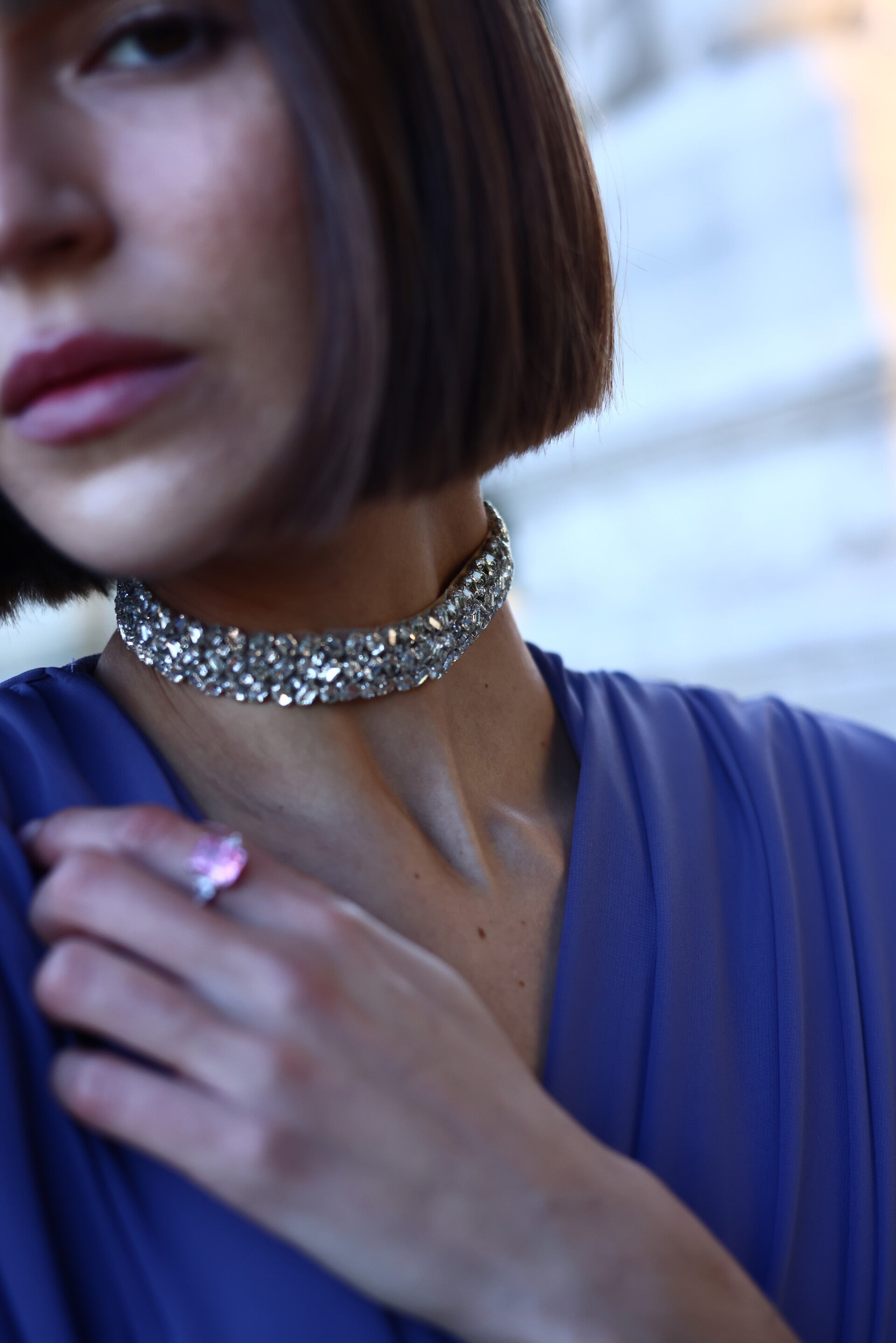 Un choker protagonista que reúne los cristales de manera compacta, creando un efecto joya intenso y deslumbrante. Su diseño aporta carácter y elegancia, captando la luz desde todos los ángulos y convirtiéndose en el centro de todas las miradas.