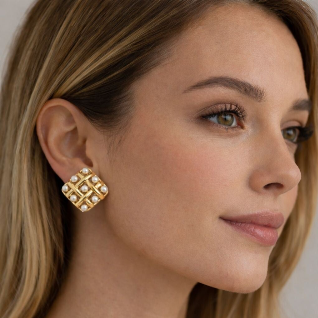 Pendientes de diseño geométrico entrelazado en acero inoxidable con acabado dorado, adornados con perlas majónicas que aportan luz y sofisticación. Su estructura aporta volumen y presencia, evocando una elegancia clásica reinterpretada desde una estética contemporánea.
