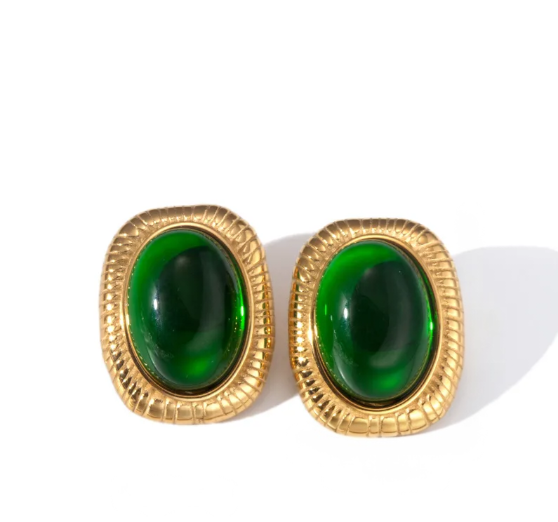 Un clásico reinterpretado con actitud contemporánea. Estos pendientes de acero inoxidable combinan un intenso verde esmeralda con un marco dorado de inspiración vintage, creando una pieza elegante, poderosa y absolutamente atemporal.