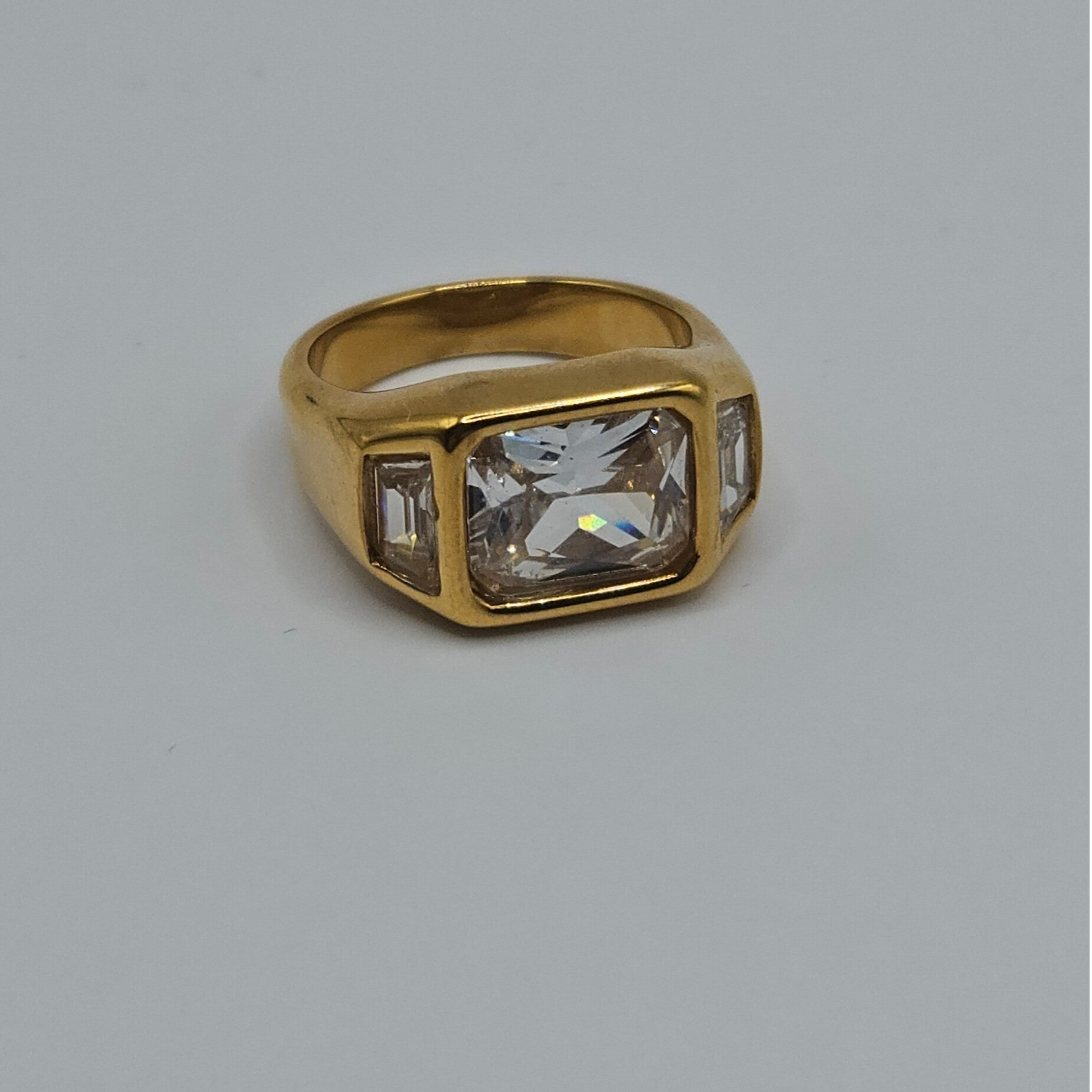 Anillo de diseño estructurado protagonizado por una circonita central de talla rectangular que capta la luz con un brillo elegante y sofisticado. Las piedras laterales aportan equilibrio y realzan su carácter contemporáneo, creando una pieza de estilo atemporal con presencia.