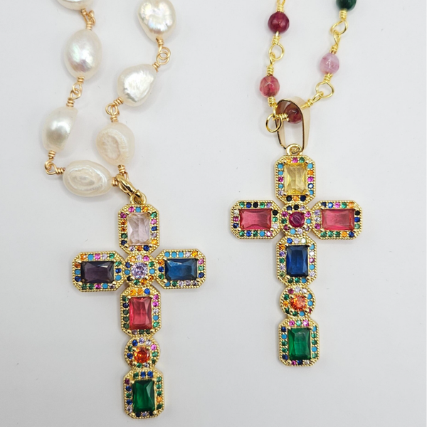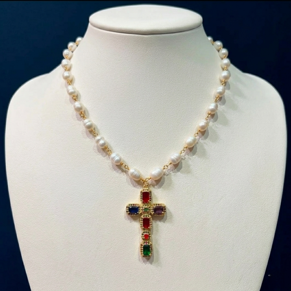 Collar de inspiración barroca que reinterpreta el romanticismo clásico con un aire contemporáneo. Su colgante en forma de cruz, rico en detalles, convierte la pieza en un elemento protagonista lleno de carácter y simbolismo.