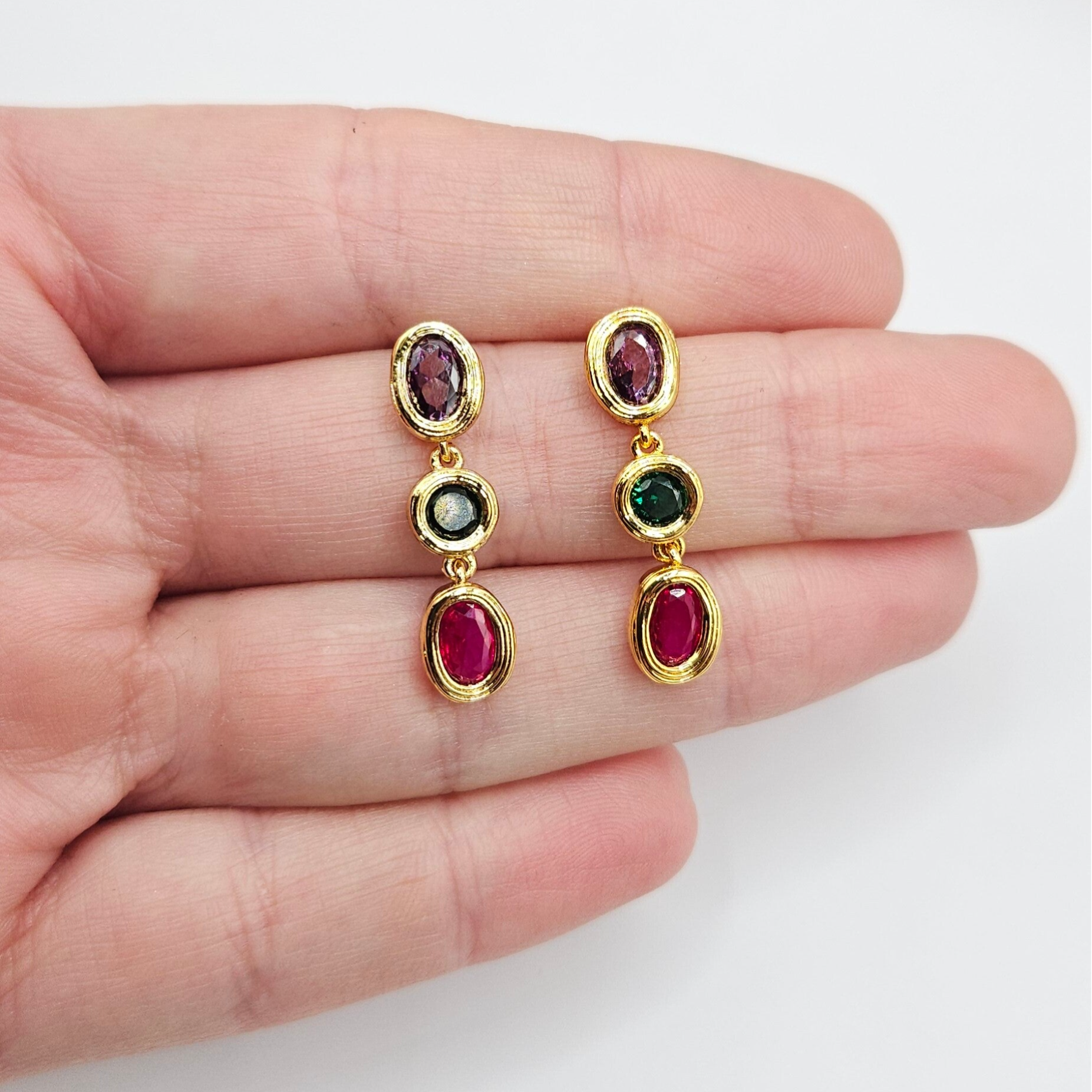 Pendientes de diseño delicado en forma de gota, protagonizados por tres circonitas de colores que aportan un brillo sutil y sofisticado. Una pieza elegante y femenina, perfecta para añadir un toque de color con discreción.