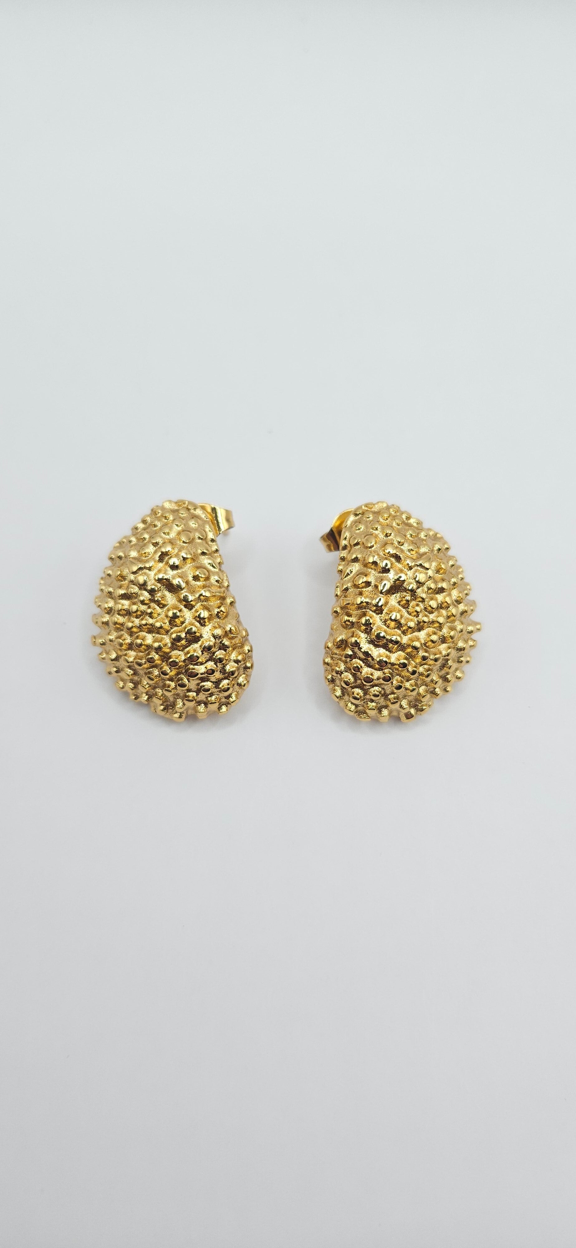 Pendientes de forma orgánica con textura irregular y acabado en oro de alto brillo. Su diseño escultórico aporta personalidad y sofisticación, convirtiéndolos en una pieza única para looks con carácter.